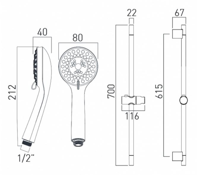 Multi function hand shower with sliding rail and 150 cm shower hose